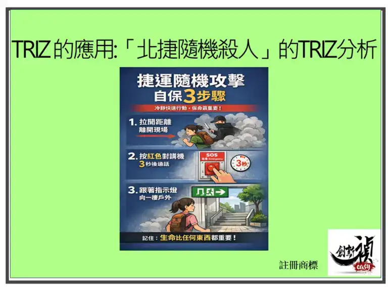 第二,我觀察到目前幾乎沒有人嘗試用 TRIZ(萃思)這套系統化創新方法,來分析這起公共安全事件,並提出「不靠勇敢、不靠對抗,而是靠系統設計」的解法。