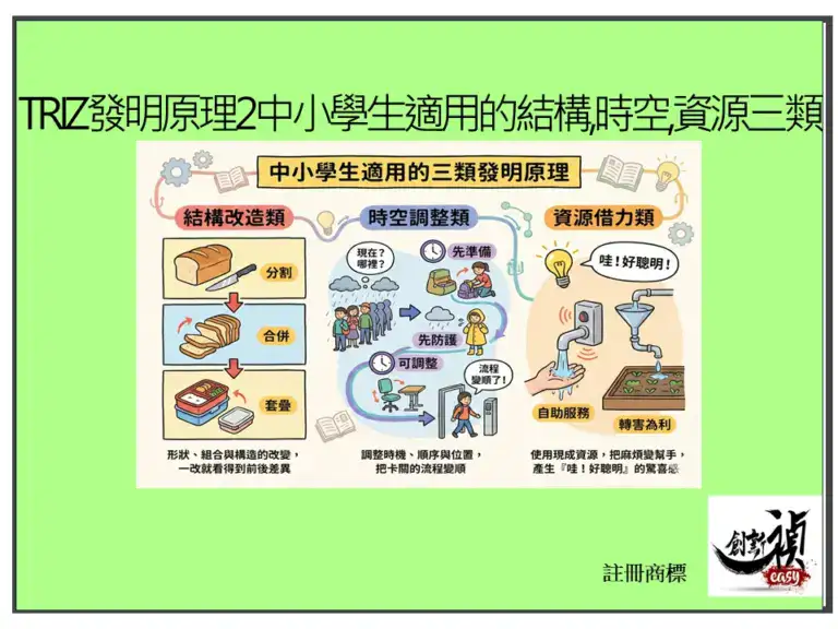 三大種類分別是:第一類結構改造類(東西怎麼變?),強調形狀、組合與構造的改變,像是「分割、合併、套疊」,一改就看得到前後差異;第二類時空調整類(什麼時候/在哪裡做?),重點不是改物品,而是調整時機、順序與位置,例如「先準備、先防護、可調整」,把卡關的流程變順;第三類資源借力類(能不能不用自己做?),引導學生使用現成資源,把麻煩變幫手,如「自助服務、轉害為利」,最容易產生「哇!好聰明」的驚喜感。這樣的分類,讓學生遇到問題時,只要先判斷「是結構、時間,還是資源的問題」,就能快速選對方向。