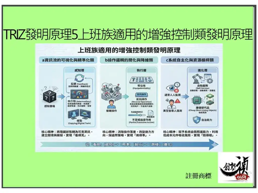 增強控制類發明原理的核心,是讓系統的狀態可見、操作可行、運作自主。當你遇到以下狀況時,這一類原理通常是最佳切入點:
