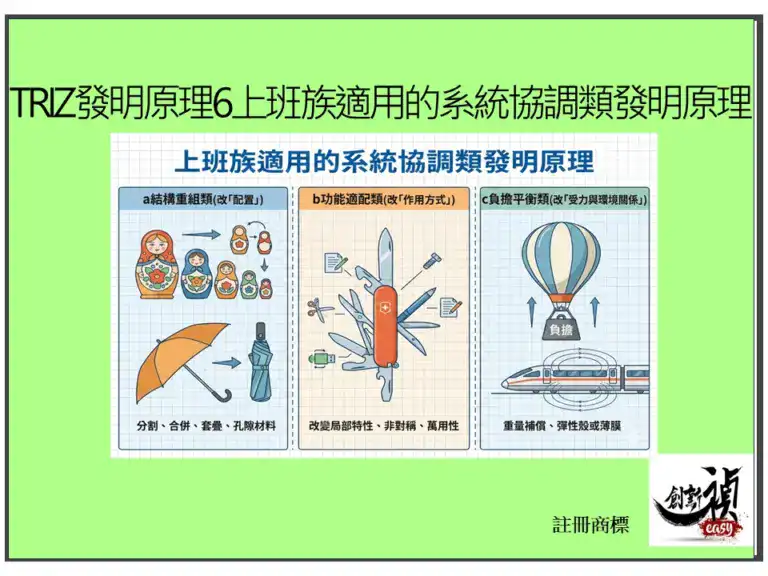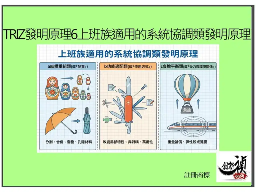 本文將這 9 個協調類原理(1, 3, 4, 5, 6, 7, 8, 30, 31)分為三大類模組——結構重組、功能適配、負擔平衡——幫你面對協調問題時直接找到對的工具。